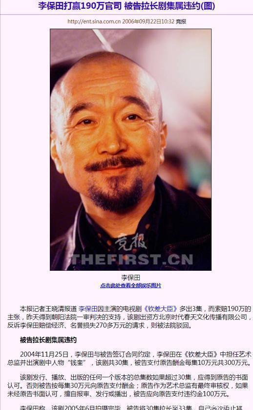李保田的个性在圈内几乎无人敢惹,因为他可是连制片人都敢公开回怼的。 戏霸 2006年的一场维权事件,让我们看到了对艺术坚守的李保田。 当年他主演的《钦差大臣》合同约定为30集,但是投资方为了赚取广告费硬生生注水成33集,将一些废镜头都剪入其中。